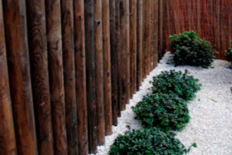 Palos torneadas fueron utilizados en forma de contención pero que también decoran el espacio. El talud fue revestido con una malla de fibra de coco y se plantó diversos tipos de enredaderas para que dentro de unos años esta pared sea totalmente verde.