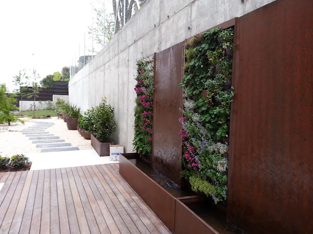 Con mención especial al jardín vertical con fuente de acero corten diseñados y elaborados por ella, creando una amplia zona que antes parecía pequeña, que es de lo más acogedor de la casa, con el relajante sonido del agua deslizándose por el acero y cayendo a las cubetas inferiores que reposan sobre tarima.